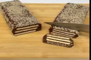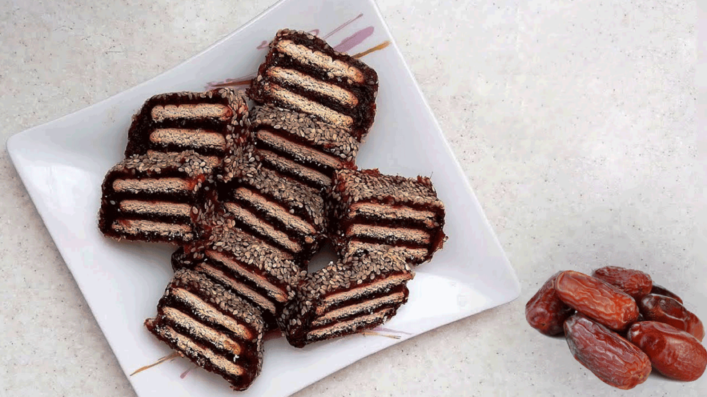 در آخرین مرحله از طرز تهیه شیرینی خرمایی با بیسکوییت بتیپور ، رولت خرمایی را از یخچال بیرون بیاورید. آن را به آرامی با چاقوی ارهای برش دهید. در آخر آنها را داخل ظرف موردنظر بچینید سپس با پودر پسته یا نارگیل تزئینشان کنید. شما شیرینی خرماییتان را در کنار شیر خرما داغ یا چای میتوانید سرو کنید.