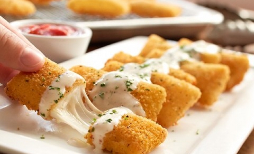 سپس هر یک از رشته های پنیر موزارلا را به درون تخم مرغ زده شده فرو ببرید و در آرد سوخاری تردک بزنید.